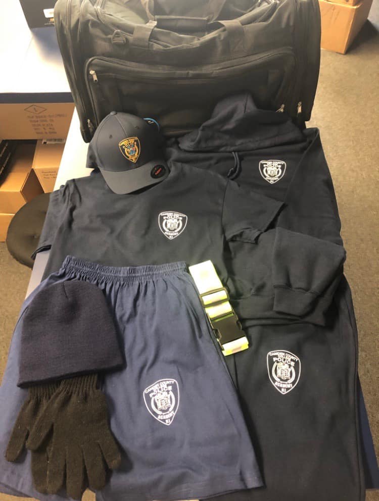 The Camden County College Police Academy recommends THREE sets of utility uniforms, THREE sets of PT uniforms, TWO navy baseball caps, TWO black garrison belts, TWO black ties and TWO silver tie clips.